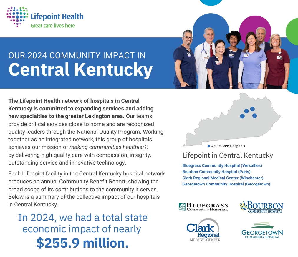 April 10, 2025GEORGETOWN, KY. (April 10, 2025) – Bluegrass Community Hospital in Versailles, Bourbon Community Hospital in Paris, Clark Regional Medical Center in Winchester, and Georgetown Community Hospital in Georgetown, which make up Lifepoint Health’s Central Kentucky market, announced today a combined community impact of nearly $255.9 million for 2024.Outlined in the…